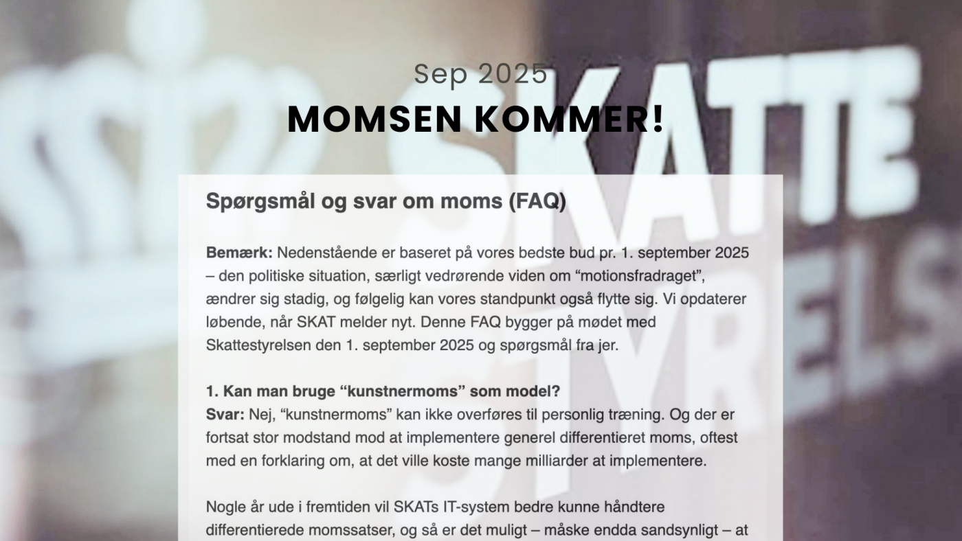 Hele træningsbranchen blev ramt af en ubehagelig overraskelse d. 22 august dagen før PTdanmark Summit – hvor vi endnu ikke kunne adressere de præcise konsekvenser. Momsen indføres fra 1. januar 2026, og vi skal gøre alt, hvad vi kan, for at forberede os.
